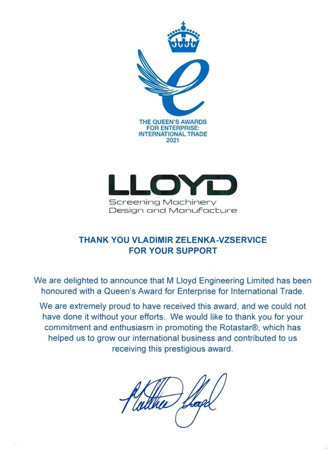 S potěšením oznamujeme, že M Lloye Engineering Limited byla poctěna Queen’s Award for Enterprise for International Trade (Královnino ocenění pro podniky za mezinárodní obchod). Jsme extrémně hrdí na to, že jsme obdrželi toto ocenění a nemohli bychom to dokázat bez vašeho úsilí. Chceme Vám poděkovat za Vaši věrnost a nadšení při propagaci Rotastar®, které nám pomohly při růstu mezinárodního prodeje a přispěly k tomu, že jsme získali tuto prestižní cenu.
